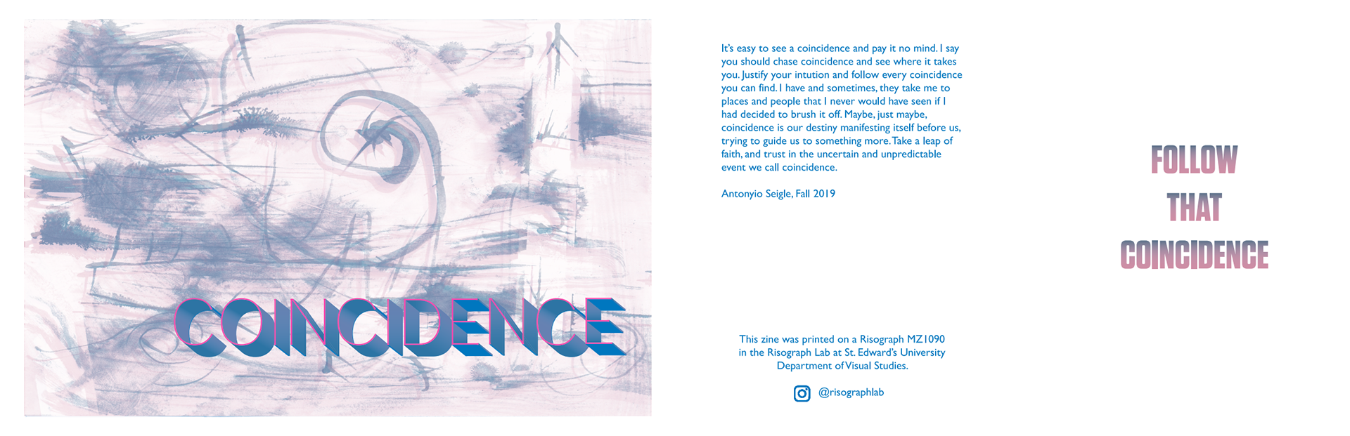 These ink and water backgrounds were then scanned and formatted properly within the dimensions of the zine, and they were finally printed in mass on the risograph machine in the design lab. With the way the risograph works we were given two colors to choose from that would be overlaid and dithered for the hues in between and eventually printed on grey paper before finally being folded, trimmed and completed.